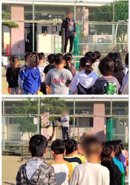 今朝の児童朝会では、生活指導の先生から「今月の生活目標」のお話が、学力向上担当の先生からは「漢字・計算クライミング」のお話がありました。