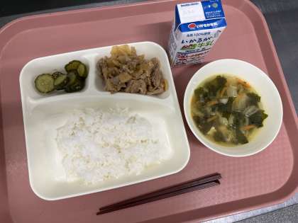 11月13日(水)の献立は「ごはん・牛乳・豚肉のコチジャンいため・鶏肉とはるさめのスープ・きゅうりのナムル」でした。