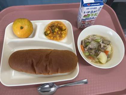 11月15日(金)の献立は「黒糖パン・牛乳・豚肉と野菜のスープ煮・変わりピザ・みかん」でした。