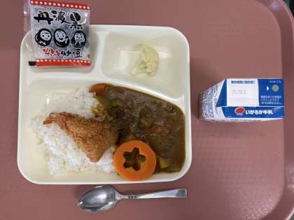 11月21日(木)の献立は「えびフライカレーライス・牛乳・カリフラワーのピクルス・いり黒豆」でした。