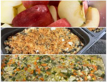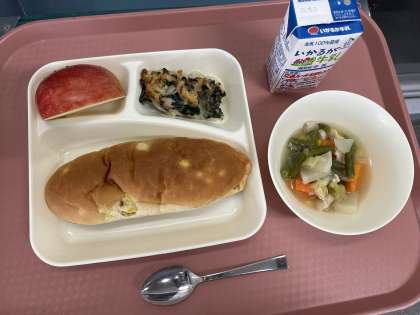 11月22日(金)の献立は「おさつパン・牛乳・ほうれんそうのグラタン・スープ煮・りんご」でした。