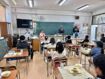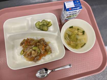 11月25日(月)の献立は「ピリ辛丼・牛乳・中華スープ・きゅうりの甘酢づけ」でした。