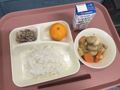 11月28日(木)の献立は「ごはん・牛乳・関東煮・れんこんの赤じそあえ・みかん」でした。