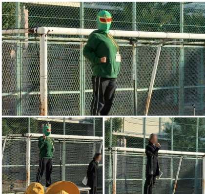 そして、朝会も終わりのころに・・・。給食担当からの連絡が。そこになんと「食育戦隊 給食レンジャー」のグリーンが「体の調子を整える、給食グリーン」とさっそうと現れました。先週の学校保健委員会の「手洗い」のことも含めて、お話をしてくれました。
