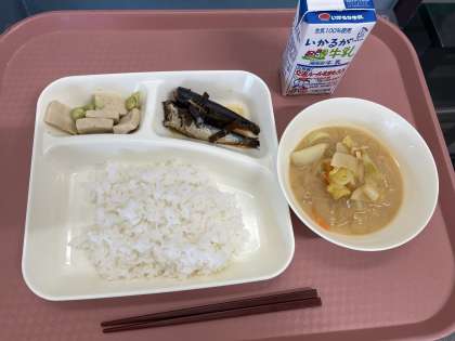 12月2日(月)の献立は「ごはん・牛乳・いわしのしょうが煮・みそ汁・高野どうふの煮もの」でした。
