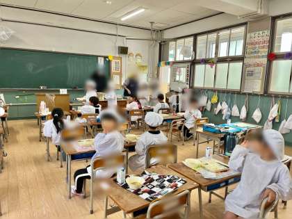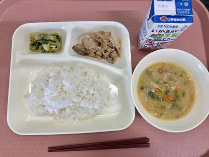 12月5日(木)の献立は「ごはん・牛乳・豚肉のしょうが焼き・さつまいものみそ汁・きくなとはくさいのごまあえ」でした。