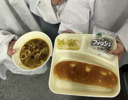 12月13日(金)の献立は「おさつパン・牛乳・カレーうどん・はくさいのおひたし・ミニフィッシュ」でした。