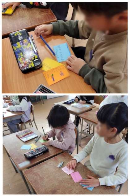 1年生は生活科の学習で、先日の「昔あそび」に来ていただいた地域の方へのお礼のメッセージカードを心を込めて書きました。