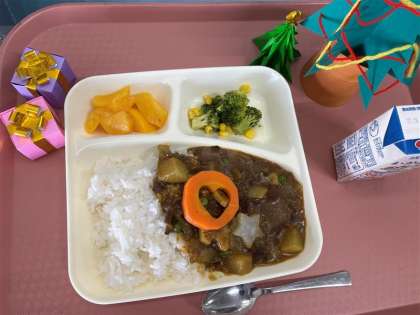 12月18日(水)の献立は「冬野菜のカレーライス・牛乳・ブロッコリーとコーンのサラダ・黄桃(カット缶)」でした。