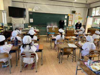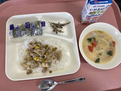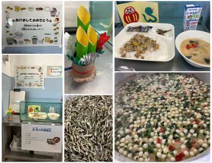 1月10日(金)の献立は正月の行事献立の「れんこんのちらしずし(きざみのり)・牛乳・ぞう煮・ごまめ」でした。