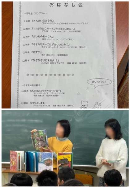 今日は、「おはなしたまでばこ」のみなさんをお招きしてのお話会がありました。各学級にいろいろな本を読み聞かせに来ていただきました。