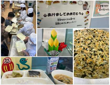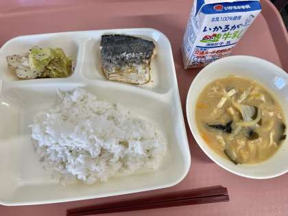 1月16日(木)の献立は「ごはん・牛乳・さごしのしょうゆだれかけ・みそ汁・キャベツの赤じそあえ」でした。