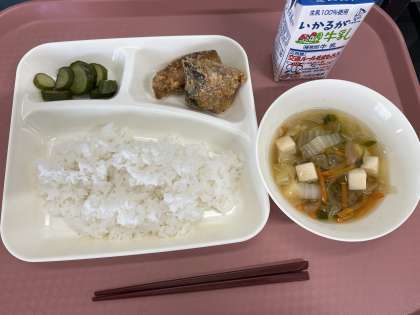 1月20日(月)の献立は「ごはん・牛乳・さばのカレーたつたあげ・五目汁・きゅうりの甘酢あえ」でした。