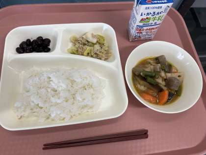 1月23日(木)の献立は「ごはん・牛乳・筑前煮・ツナとキャベツのごまいため・黒豆の煮もの」でした。