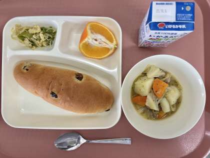 2月7日(金)の献立は「レーズンパン・牛乳・ポトフ・カレーソテー・いよかん」でした。
