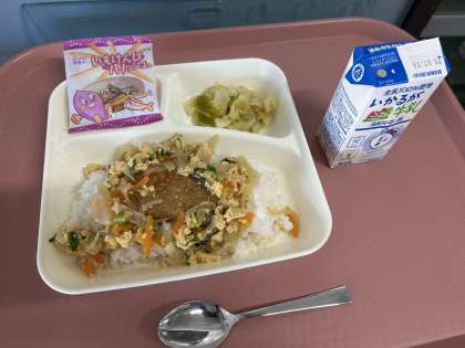 2月26日(水)の献立は「カツ丼・牛乳・キャベツの梅風味・いもけんぴフィッシュ」でした。