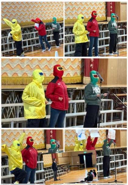 給食委員会からは、食育戦隊「給食レンジャー」が登場してくれました。今回は「ちびっ子」給食レンジャーの登場でした。給食アンケートについても連絡がありました。