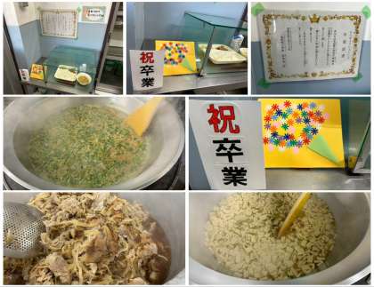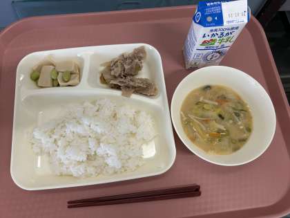 3月10日(月)の献立は「ごはん・牛乳・豚肉のしょうが焼き・みそ汁・高野どうふの煮もの」でした。