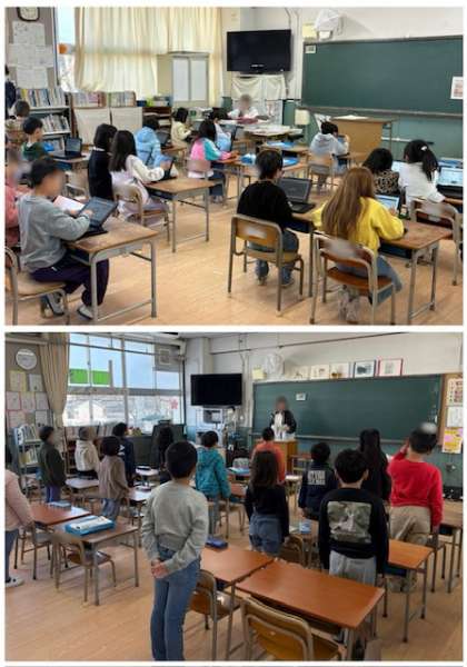 1年生は朝の活動で、1人1台パソコンを使った学習をしたり、入学式のお迎えのことばを練習したりしています。