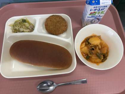 3月19日(水)の献立は「黒糖パン・牛乳・チキンレバーカツ・ケチャップ煮・ツナとキャベツのバジルソテー」でした。