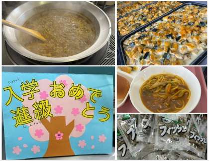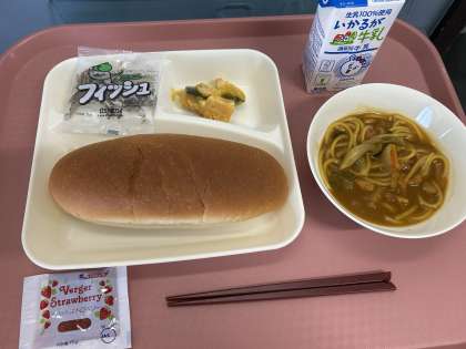 今日から給食が始まりました。4月9日(水)の献立は「コッペパン(いちごジャム)・牛乳・カレースープスパゲッティ・かぼちゃのマリネ焼き・ミニフィッシュ」でした。