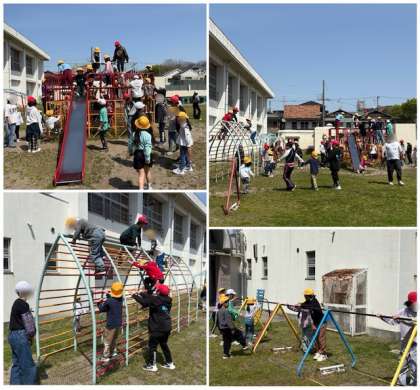 1年生と6年生合同で、中庭(アスレ)と運動場で一緒に楽しく遊びました。
