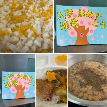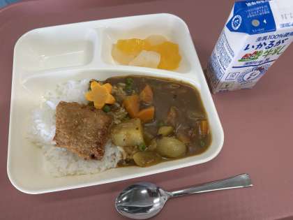 4月14日(月)の献立は入学祝い献立の「カツカレーライス(ラッキーにんじん入り)・牛乳・フルーツゼリー」でした。