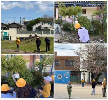 運動場や中庭(アスレ)の春の生き物を、タブレットで撮影しています。
