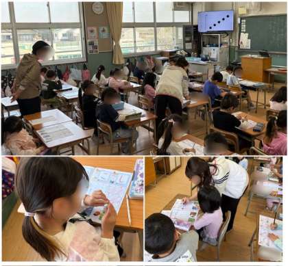 1年生の国語では、今日はひらがなの「こ」を習いました。丁寧に練習をしています。