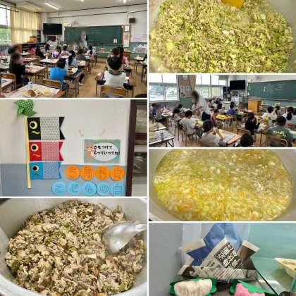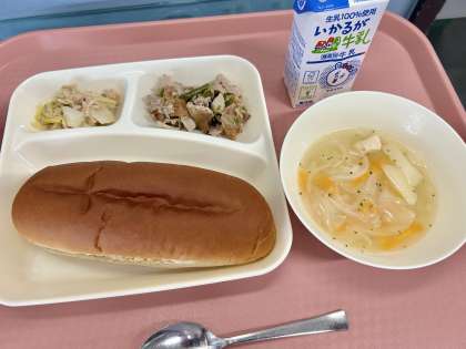 4月23日(水)の献立は「黒糖パン・牛乳・豚肉のガーリック焼き・スープ・ツナとキャベツのソテー」でした。