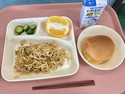 4月25日(金)の献立は「ミニコッペパン・牛乳・焼きそば・きゅうりのしょうがづけ・あまなつかん」でした。