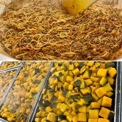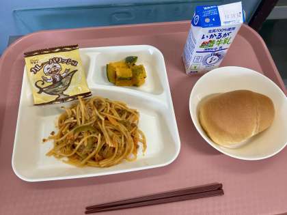 5月7日(水)の献立は「ミニコッペパン・牛乳・ミートソーススパゲッティ・焼きかぼちゃ・カレーフィッシュ」でした。