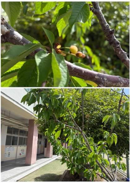 職員室前のさくらんぼの木に、今年もさくらんぼの実がつきました。