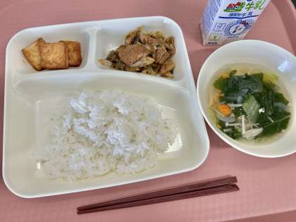 5月8日(木)の献立は「ごはん・牛乳・ホイコウロー・中華スープ・あつあげのピリ辛じょうゆかけ」でした。