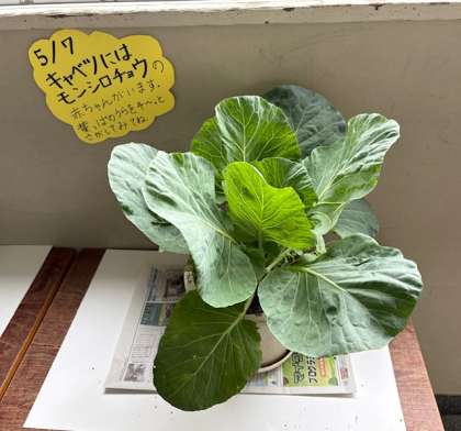 キャベツの葉には、モンシロチョウの卵や幼虫がいるみたいですね。