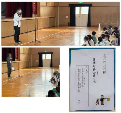 生活指導担当の先生から、5月の月目標のお話がありました。また、体育担当の先生からは、今週からスタートする業間体育について連絡がありました。