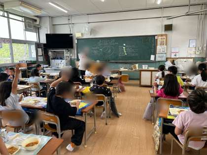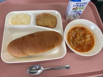 5月12日(月)の献立は「レーズンパン・牛乳・トンカツ・ミネストローネ・和なし(カット缶)」でした。