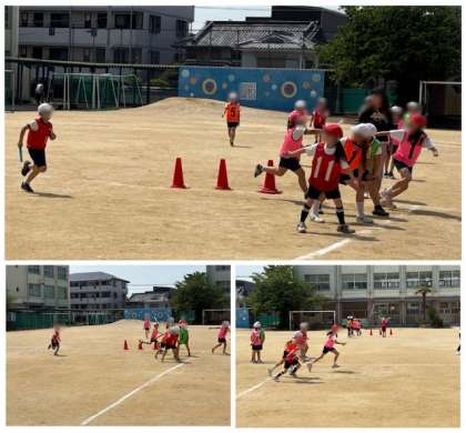 4年生はリレーのバトンパスを練習しています。