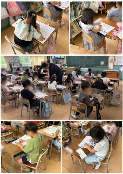 1年生の今日のひらがなは、「す」と「の」でした。文字のバランスが難しいですね。教室をのぞくと、書く姿勢がとても良い児童がたくさんいました。1年生がんばって書いています。