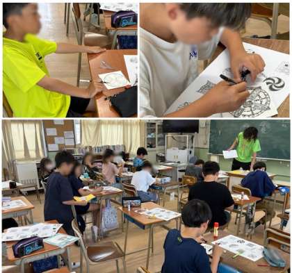 5年生は図工でおしゃれな柄のカアツムリを描いていました。独特なデザインを描いていました。