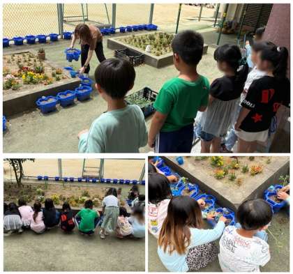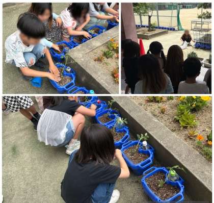 2年生は生活科でミニトマトの苗を、一人ずつの鉢に植えました。これからミニトマトの成長を観察します。