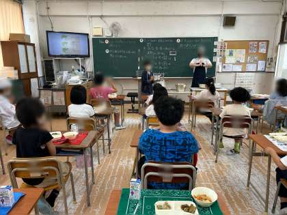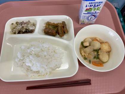 5月29日(木)の献立は「ごはん・牛乳・ちくわのいそべあげ・あつあげとさといものみそ煮・キャベツの赤じそあえ」でした。