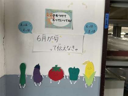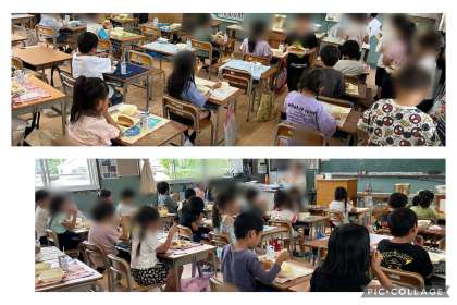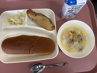 6月2日(月)の献立は「黒糖パン・牛乳・サーモンフライ・豆乳スープ・キャベツのゆずドレッシング」でした。