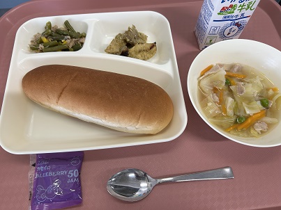 6月4日(水)の献立は「コッペパン(ブルーベリージャム)・牛乳・鶏肉のカレー風味焼き・スープ・ツナとさんどまめのソテー」でした。
