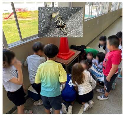 2年生の教室前の廊下に、3年生のアゲハチョウのサナギがいます。今日、そのサナギからアゲハチョウの成虫が出てきました。「すごくきれい」その様子を2年生が見ていました。