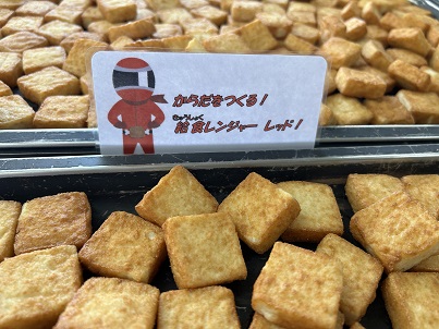 あつあげはとうふと同じで大豆から作られます。3色食品群の「からだをつくるもとになる」赤色の食べものです。