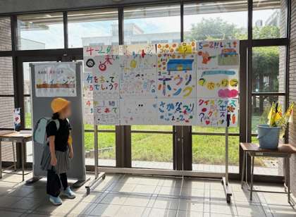 玄関には13日に実施する、東小フェスティバルの各クラスの出し物のポスターが掲示してあります。どんなお店になるか楽しみですね。