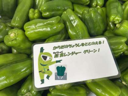 今日、紹介する食材は「ピーマン」です。ビタミンやミネラルが豊富に含まれている野菜です。特にビタミンCは、美肌効果や免疫力向上、風邪予防に役立ち、β-カロテンは抗酸化作用があり、老化防止やがん予防に効果があるといわれています。3色食品群の「からだの調子を整える緑」の食べものです。