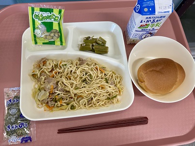 6月18日(水)の献立は「ミニコッペパン・牛乳・和風焼きそば(きざみのり)・オクラのかつお梅風味・まっ茶大豆」でした。
