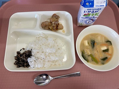 6月19日(木)の献立は「ごはん・牛乳・鶏肉の甘辛焼き・みそ汁・魚ひじきそぼろ」でした。